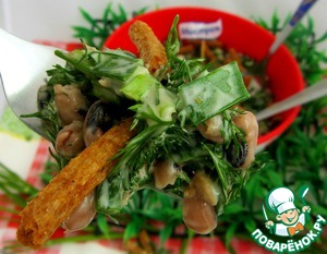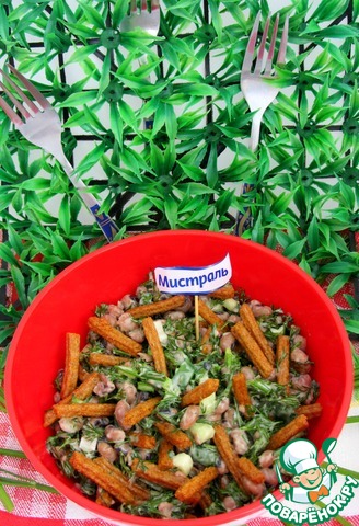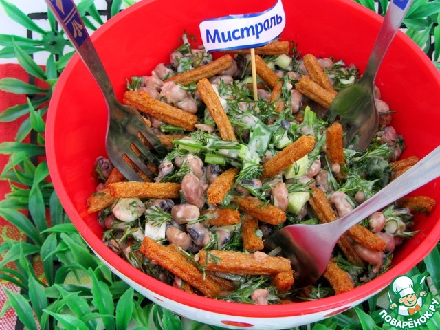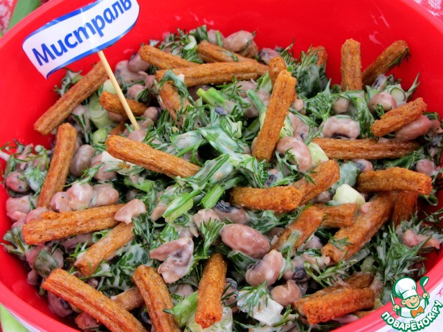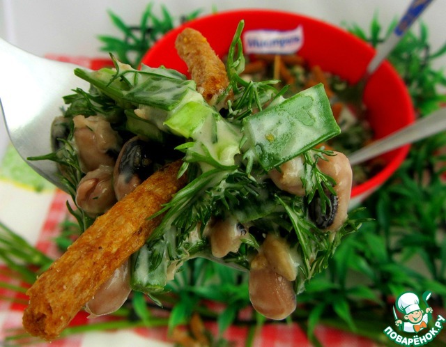 Заправить майонезом и перемешать. По желанию можно посолить, но я этого не делаю. Сухарики добавляем за 5-10 минут до подачи на стол.