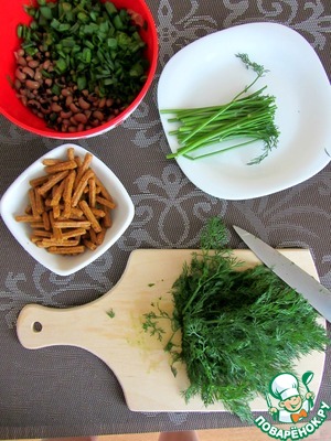 Лук и укроп промыть и обсушить. Лук нарезать и отправить в тарелку к фасоли.