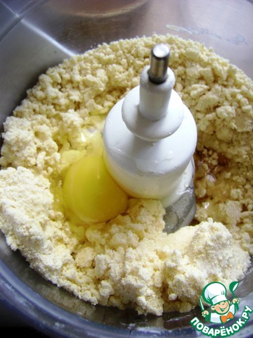 В чашу комбайна высыпать просеянную с крахмалом муку, добавить соль и нарубленное кусочками холодное масло. Пробить в крупную крошку в пульсовом режиме.