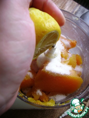 Выбрать тыквенную мякоть в блендер, добавить сахар и лимонный сок, и пробить в пюре. Отмерять 450 мл.