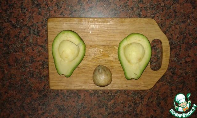 • 1. Помыть авокадо, разрезать на 2 части, достать косточку, по желанию снять шкурку.