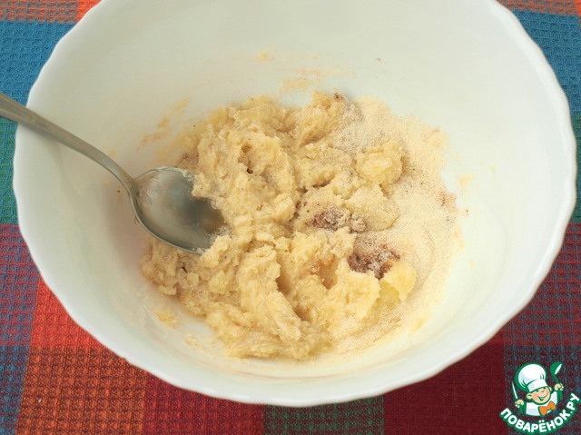 • Смешать сахар, мёд и мягкое сливочное масло. Далее добавить манную крупу, имбирь и мускатный орех. Смешать и оставить на 7-8 минут.