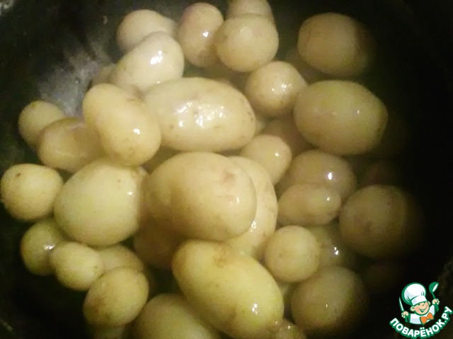 Моем молодой картофель и ставим его варить. Я варил в казане, чтоб потом не перемещать в другую посуду