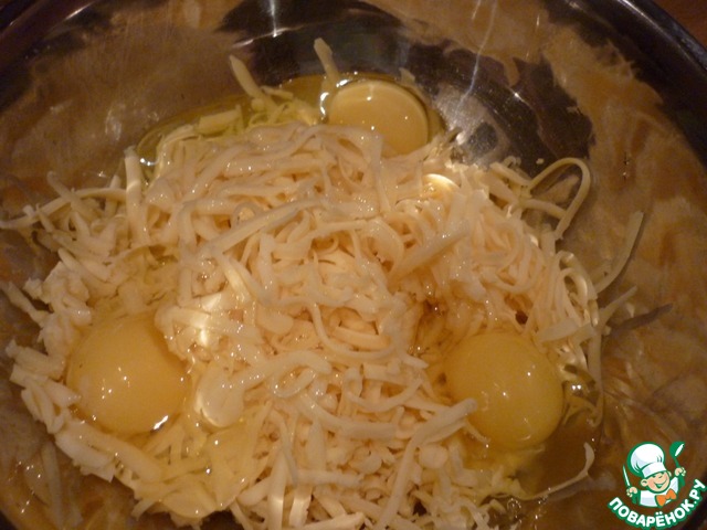 Сыр натереть на крупной тёрке и перемешать с яйцами.