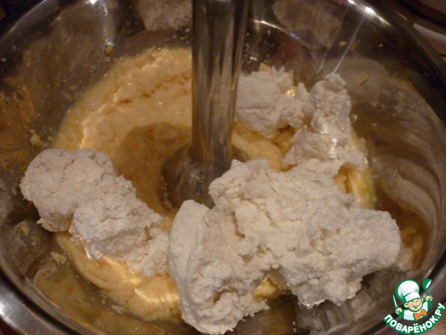 Добавить муку с разрыхлителем. Тесто должно быть как густая сметана, поэтому смотрите, возможно муки понадобится и чуть больше.