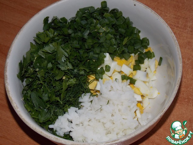 Яйца нарезать кубиком, добавить отварной рис и порезанную зелень петрушки, укропа и лука. Посолить по вкусу. Перемешать.