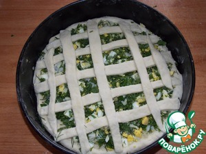 Сверху начинки выложить небольшие полоски из теста. Можно смазать яйцом (я не смазывала). Выпечь в разогретой духовке при 180 С 25-35 минут.