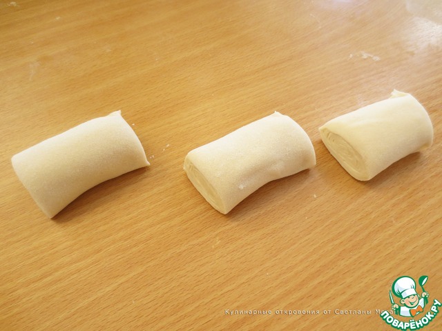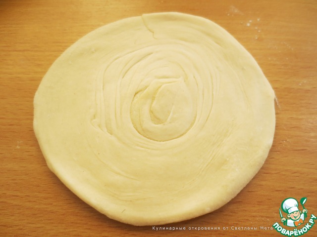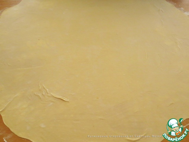 Рабочую поверхность присыпаем мукой и раскатываем тесто в большой пласт, толщиной не более 1 мм.