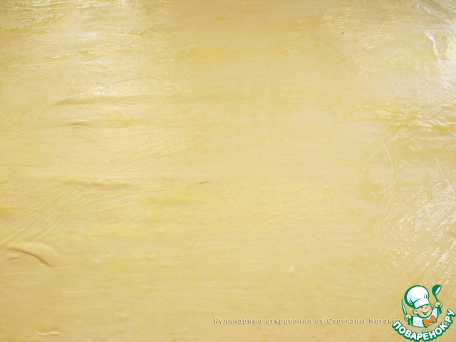 Растапливаем сливочное масло, оставляем остыть и затем равномерным слоем смазываем им поверхность пласта