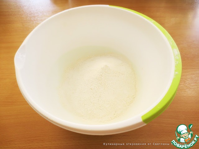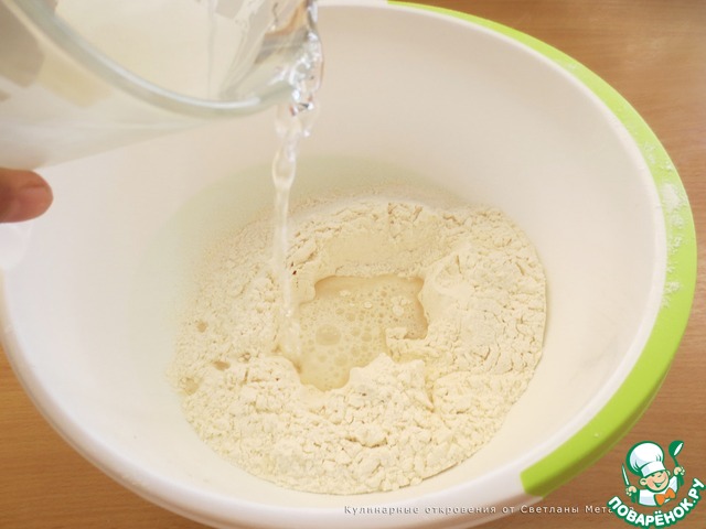 В глубокую миску просеиваем муку, добавляем в нее соль, перемешиваем