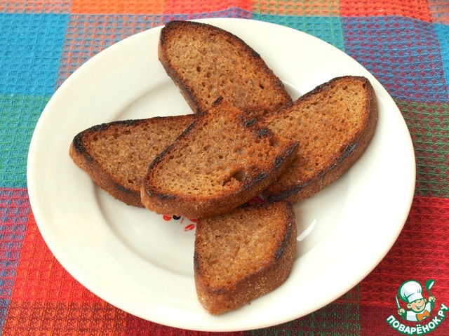 Обжарить на подсолнечном масле ломтики чёрного хлеба с одной стороны. Ещё горячими натереть их чесноком.