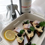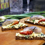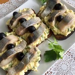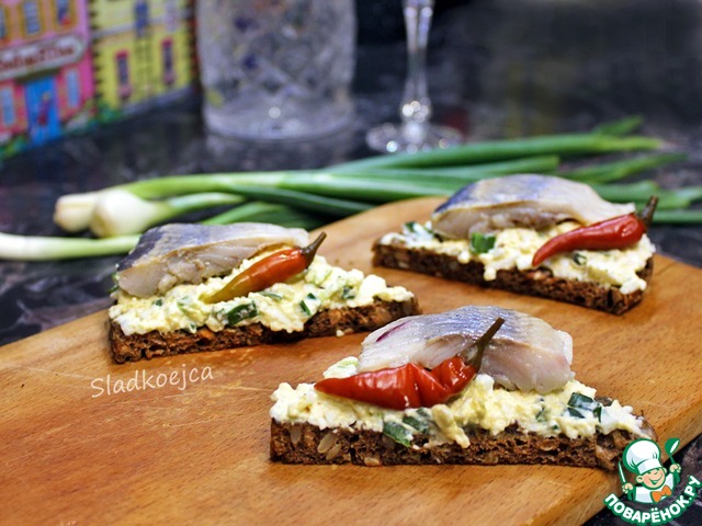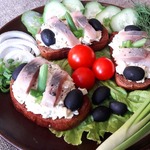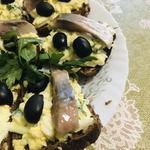 На обжаренную сторону намазать подготовленную начинку. Сверху выложить сельдь и половинку маслины.