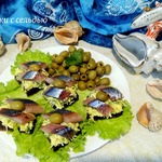 Разобрать сельдь на филе, нарезать порционными кусочками. Пополам разрезать маслины для подачи.