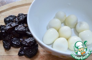 Сварить перепелиные яйца, почистить. Чернослив порезать пополам.