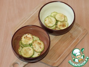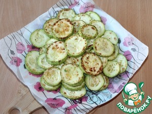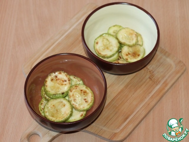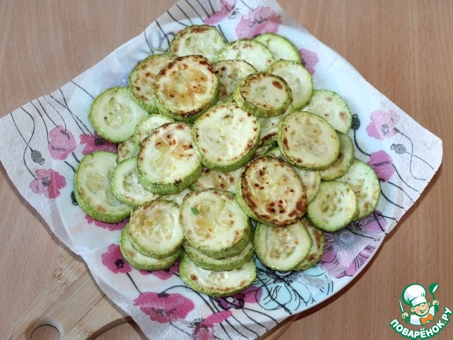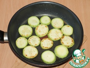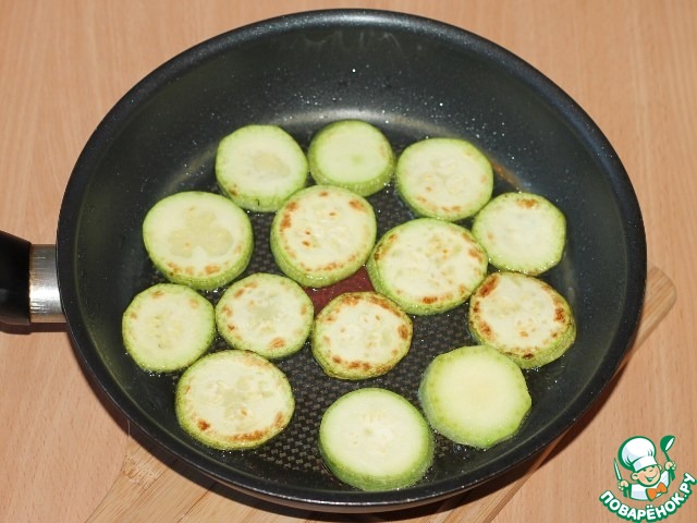 6. Приготовим кабачки. Кабачки вымыть, обсушить и нарезать кружочками толщиной 5 мм. Обжарить кабачки в растительном масле с двух сторон до образования золотистой корочки.