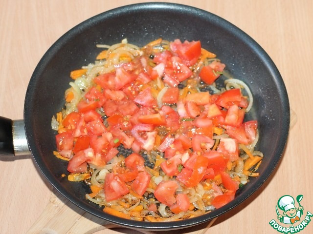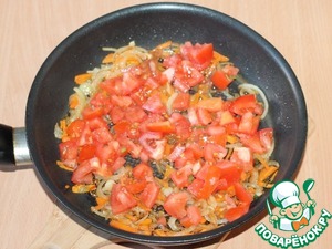 10. И минут через 5 выложить туда же порезанные помидоры, посолить, поперчить. Тушить около 5 минут.