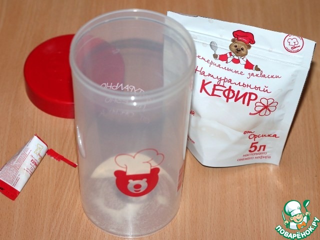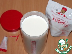 В литровую емкость высыпать 1 пакетик с закваской (3 г) для кефира,