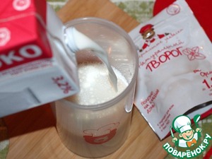 5. Приготовим творог. В литровую емкость влить молоко комнатной температуры и всыпать 1 пакетик (3г) закваски для творога. Молочную смесь перемешать чистой, сухой ложкой в течение 2-3 минут до полного растворения закваски.