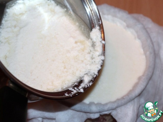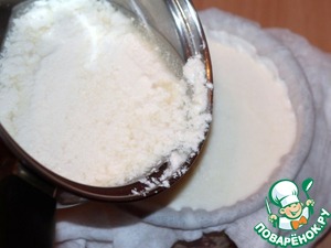 9. А в это время приготовить дуршлаг и марлю. Сложить марлю в 2-3 слоя. Выстелить дуршлаг марлей и осторожно вылить содержимое кастрюли. Дать сыворотке стечь, т. е некоторое время дать полежать в дуршлаге.