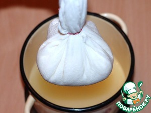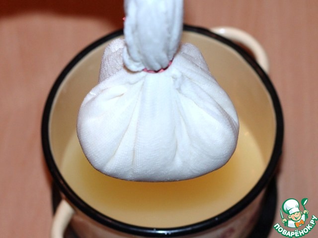 10. Потом аккуратно собрать все концы марли в кулек, закрутить и завязать. Подвесить для стекания сыворотки. Как только сыворотка стечет, т. е перестанет капать ( примерно через 1-2 часа ), творог готов. У меня получилось ~270 г нежнейшего творога. Готовый творог переложить в отдельную емкость, а затем в холодильник.