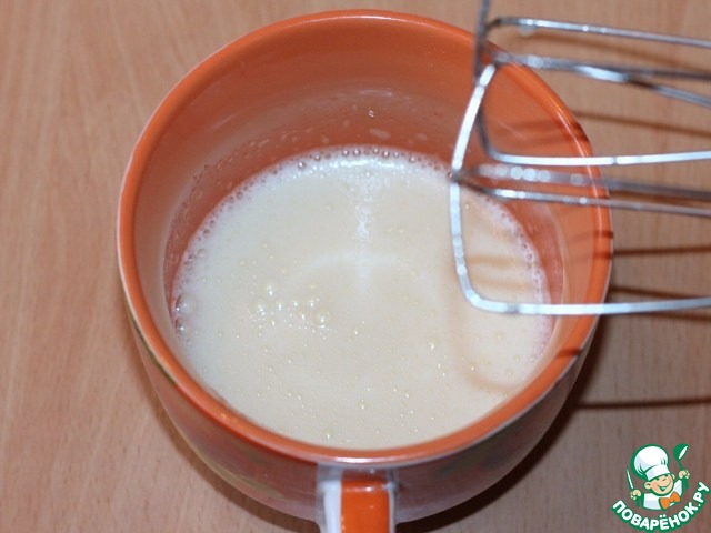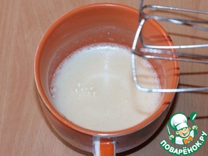 Вымойте хорошо куриное яйцо. Смешайте яйцо с сахаром. Взбейте миксером яичную смесь до бела.