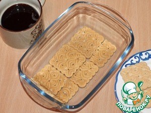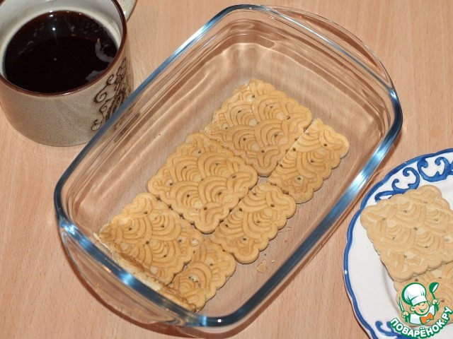 15. Подготовьте формочку для тирамису. Песочное печенье обмакните в кофе и уложите на дно формы.
