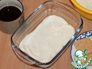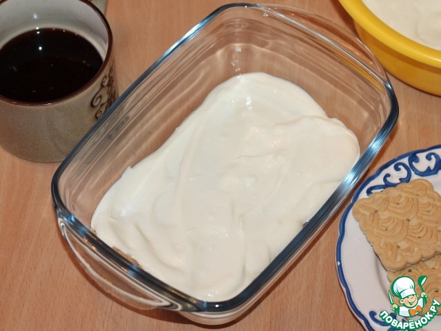 16. Сверху, залейте печенье слоем крема. Затем снова укладываем печенье, пропитанное кофе и слой крема. Повторяйте до заполнения формы.