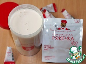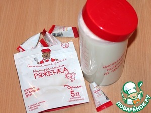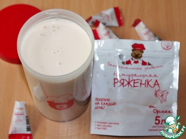 Простерилизовать посуду для приготовления ряженки. Топленое молоко (1 л) комнатной температуры, влить в литровую емкость, высыпать 1 пакетик с закваской для ряженки (3 г).