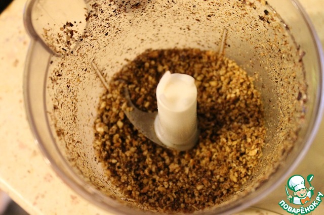 Орехи поджарить на сухой сковороде до золотистого цвета, затем измельчить в блендере до состояния мелкой крошки.