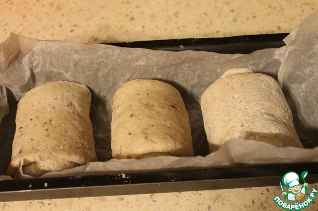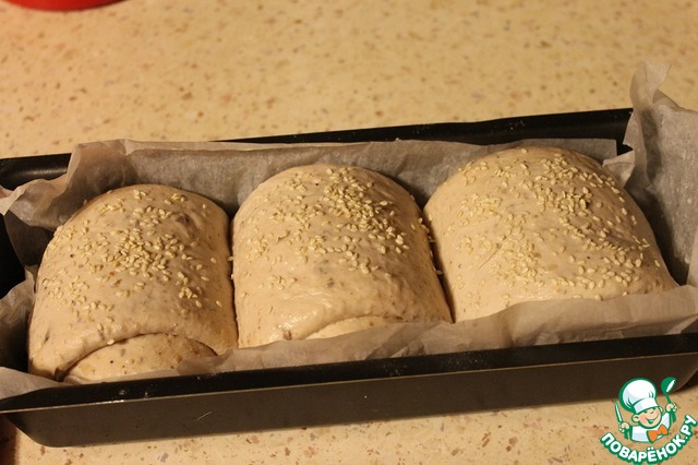 Форму для выпечки застелить пергаментом, смазать 1 ч. л. растительного масла, выложить три рулетика, смазать водой и посыпать сверху кунжутом. Накрыть полотенцем и оставить на расстойку на 50 минут.