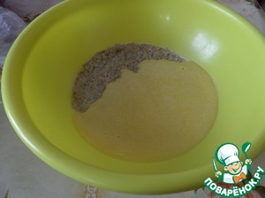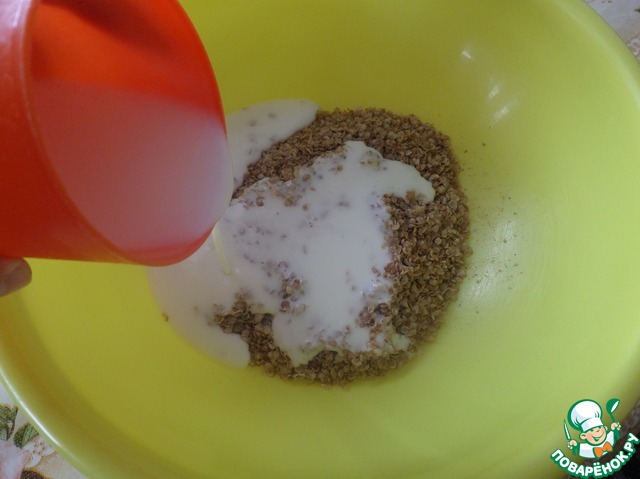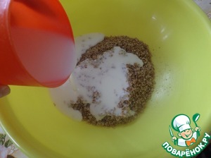 Отмерила необходимое количество гречневых хлопьев. Высыпала их в чашку и добавила кефир. Перемешала массу. Оставила на 10 минут.