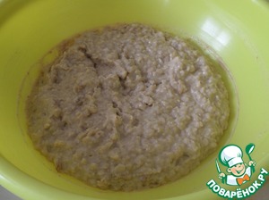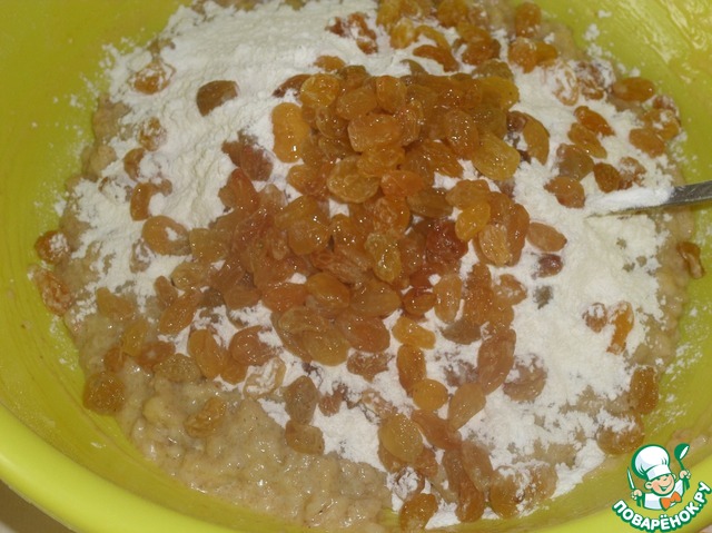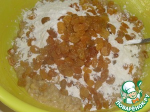 В чашку просеяла муку и высыпала разрыхлитель теста. Добавила распаренный изюм. Перемешала массу.