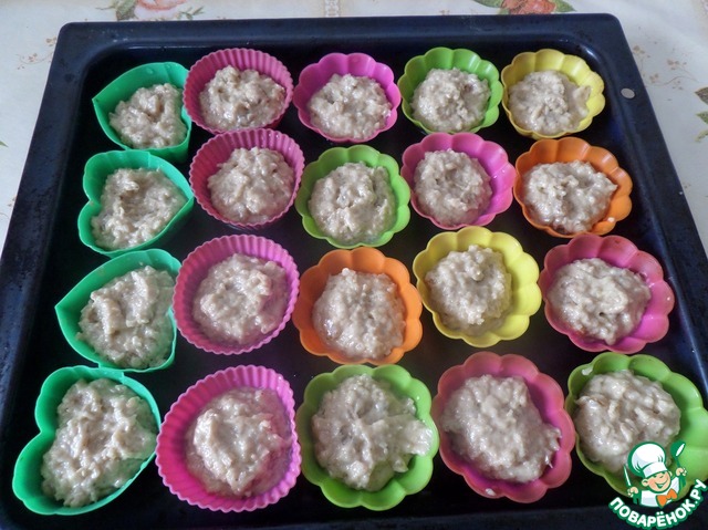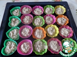 Выложила тесто в силиконовые формочки, предварительно смоченные водой. У меня получилось 20 шт.