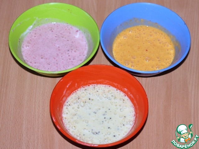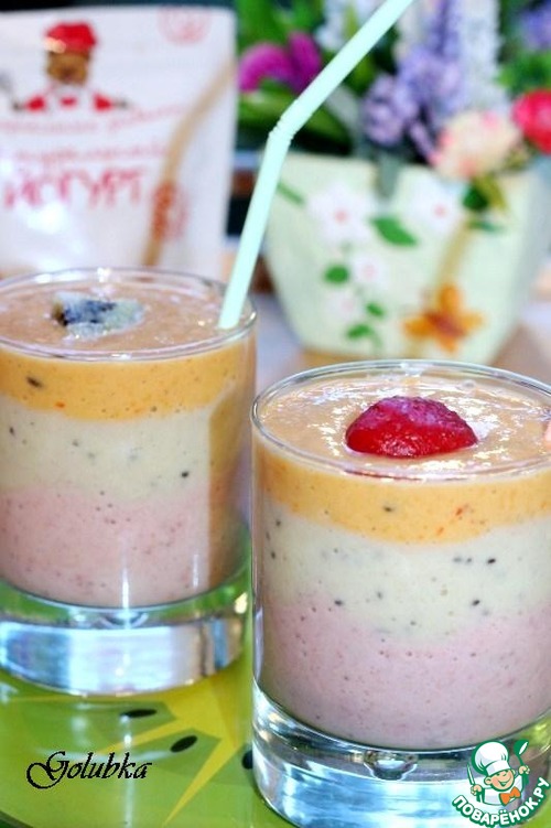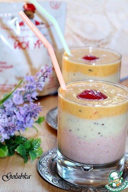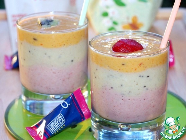 8. Затем разливаем по бокалам, чередуя слои. В смузи можно добавить кусочек мороженного и ягоду. Подаем смузи охлажденным.