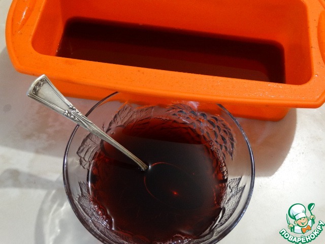 Желатиновую массу делим на три части. Одну часть смешиваем с остывшим и процеженным чаем каркаде, куда добавляем сахар по вкусу. Выливаем первым слоем и ставим в холодильник до застывания.
