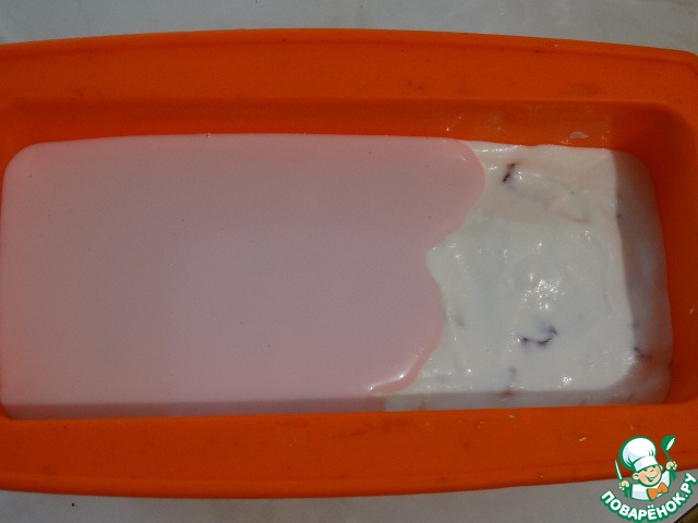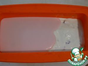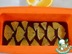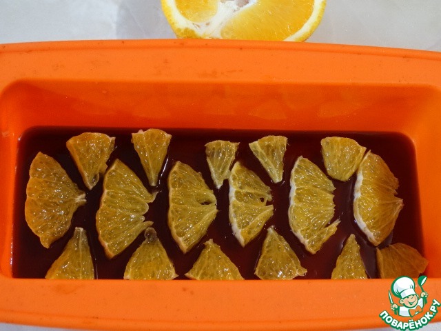 Заливаем апельсиновые кусочки йогуртно-желатиновой смесью и ставим опять в холодильник для застывания. Делаем это в два приема, чтобы апельсиновые кусочки не всплыли.