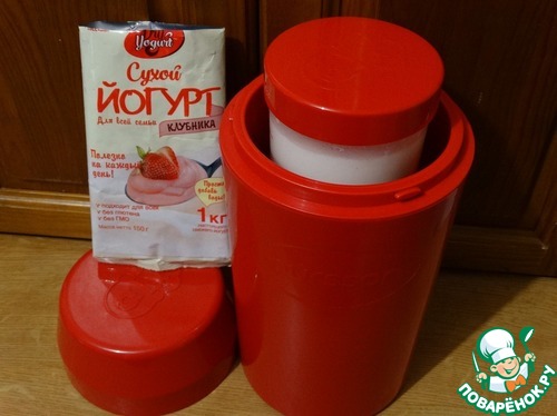 Это мой первый опыт использования сухой смеси от Орсика для приготовления йогурта. Понравилось, что не надо бежать в магазин за молоком, достаточно к обычной кипяченой воде комнатной температуры добавить сухую закваску из пакетика. Все тщательно перемешивается 2-3 минуты, закрывается крышкой и помещается в специальный термос, куда налита вода t 100*. Термос помещаем в теплое место и ждем 6-10 часов. Я поставила на ночь, а утром можно было наслаждаться свежим и ароматным йогуртом.