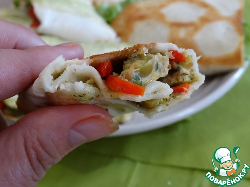 В первом - намазала одну сторону лепешки творожной массой, сверху уложила овощи с кусочками омлета и свернула трубочкой. -