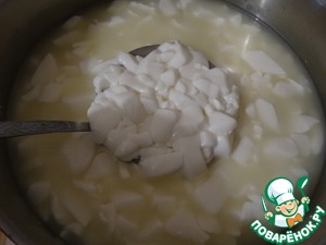 Закрываем емкость крышкой и помещаем в термос, предоставленный компанией Oursson, предварительно залив в него воду с температурой 100 градусов. Через 6-10 часов образуется сгусток. Его мы разрезаем ножом на кубики в 1.5-2 см. Емкость ставим на водяную баню, нагреваем до 50-60 градусов и выдерживаем до уплотнения сгустков (10-15 минут).