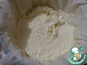 Выкладываем творог на марлю или натуральную ткань, чтобы стекла сыворотка. Сегодня мне хотелось получить творог с нежной текстурой, поэтому отцеживание было кратковременным.