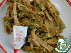 Взобьем яйца с солью и паприкой, добавим нарезанный зеленый лук и консервированный горошек и приготовим омлет на сливочном масле. Обжариваем с двух сторон. -