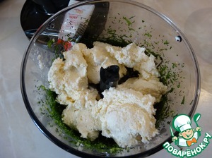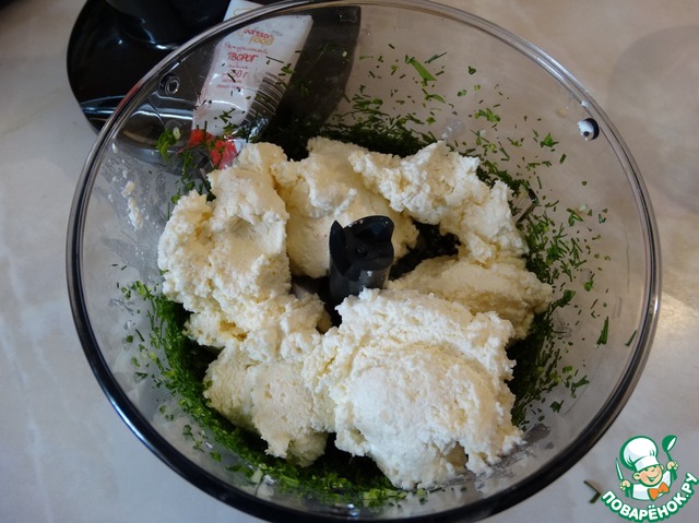 К измельченной зелени добавляем холодный творог и взбиваем до пышности.