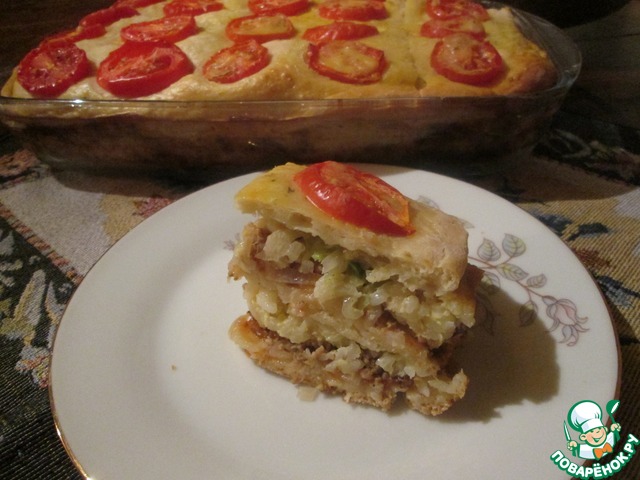 Затем рис, потом капусту. Заливаем половиной смеси молока и яиц, накрываем второй лепешкой и повторяем все слои еще раз. Поливаем оставшейся заливкой.