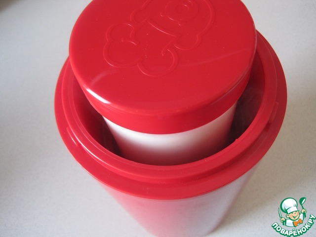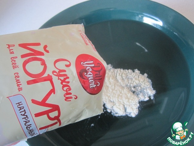С такой сухой закваской я готовила впервые. Очень понравилась простота в приготовлении, особенно то, что закваску растворяем в обычной воде. Бывает, что забудешь купить молока, а с этой закваской к утру имеем густой очень вкусный домашний йогурт без молока. В воду комнатной температуры всыпаем сухой йогурт "натуральный"