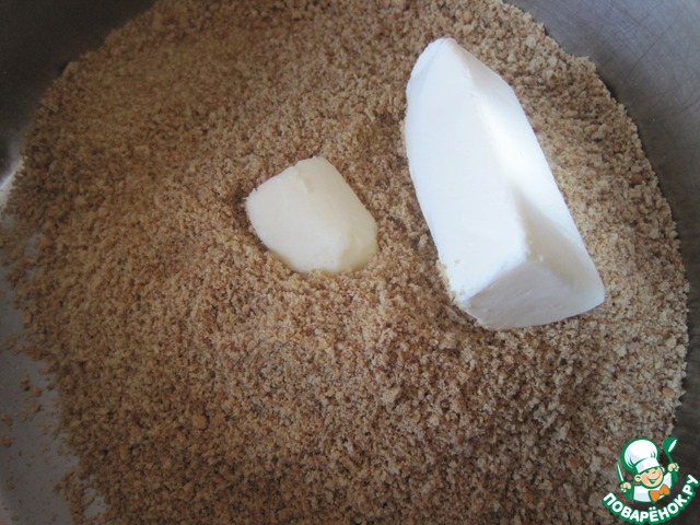Крекер измельчаем (я измельчила при помощи скалки на столе), добавляем сливочное масло.
