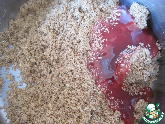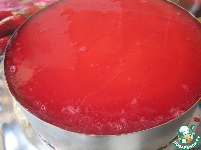 Заливаем желе. Желе готовила из замороженной малины. Сок выжимаем, добавляем сахар, замоченный и растворенный желатин. Ставим в холодильник для застывания желе.