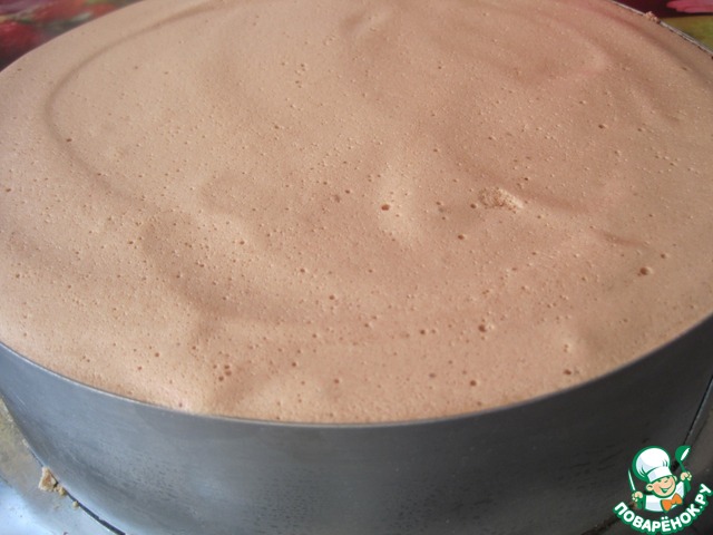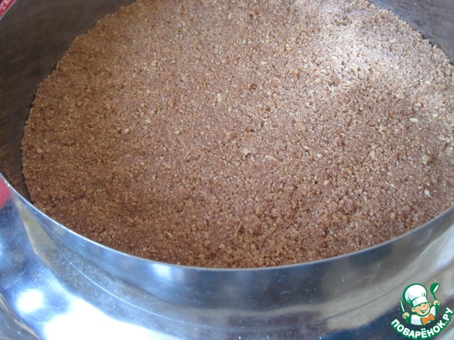 Выкладываем в кольцо диаметром 28 см. Немного трамбуем и ставим в холодильник.