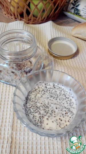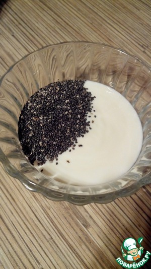 Смешиваем семена чиа и 100 мл мацони. Убираем на ночь в холодильник. Немного о семенах чиа - это кладезь полезных веществ! 2 ст. л. сухих семян чиа содержат жирные кислоты омега-3, 41% от дневной нормы пищевых волокон (клетчатки); кальций, магний, железо, калий, вдвое больше антиоксидантов, чем в голубике. Кроме этого, семена чиа содержат: цинк, фосфор, витамин А, Е и С, тиамин, ниацин, рибофлавин.