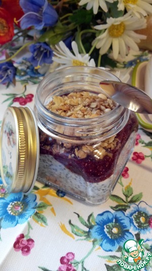 Далее на гречку выкладываем пудинг из мацони. Семена чиа на ночь разбухают и делают мацони очень интересным, похожим на пудинг...