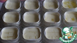 Разрезаем получившийся сгусток ножом вдоль и поперек емкости шагом 1-1,5 см (вид сверху - решетка).